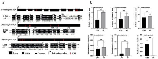 Gene structure, protein alignment, and expression analysis of the candidates. (a) Gene structures and variations between alleles from L780 and MI. The asterisk symbolizes the terminator, numbers represent the location of amino acids and apostrophes indicate omitted amino acids; (b) Relative expression of candidates in shoot apical meristem (SAM). Student’s t test was used for statistical analysis; values are the mean ± standard deviation (SD) of three biological replicates (** p < 0.01, ns indicated no significant difference).