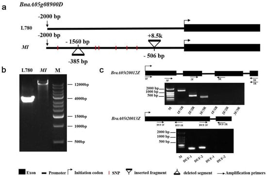 When comparing the promoter region these 14 genes between L780 and MI mutant, a 8.5 kb insertion in the regulatory region 506 bp upstream of BnaA05g08900D was identified by Sanger sequencing (Figure 5a,b). The obtained sequence was listed in Supplementary File S2. The identified 8.5 kb sequence was then blasted in NCBI (https://blast.ncbi.nlm.nih.gov/Blast.cgi, last accessed on 6 April 2022) and the alignment result indicated that this sequence come from A05 chromosome of Brassica rapa and it contains two genes BraA05t20012Z (ORF12) and BraA05t20013Z (ORF13) (Figure 5c).