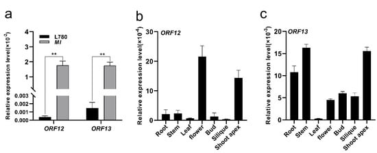 Relative expression and expression pattern of ORF12 and ORF13. (a) Relative expression of ORF12 and ORF13 in SAM of MI. Expression pattern of ORF12 (b) and ORF13 (c) detected by qRT−PCR in roots, stems, leaves, flower, buds, siliques, and shoot apex of MI. Values are expressed as average ± SD (n = 3). Student’s t test was used for statistical analysis; values are the mean ± standard deviation (SD) of three biological replicates (** p < 0.01).