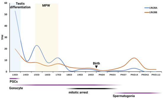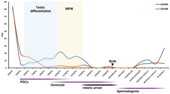 mRNA expression of LIN28AB across human testis development. Expression levels of LIN28AB mRNAs are shown in transcripts per million (TPM). MPW—masculinization programing window. Data available free online [58,59]. Graph created with BioRender.com (accessed on 4 May 2022).