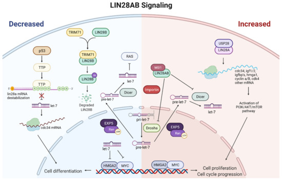Schematic representation of the main LIN28A and LIN28B signaling. The left panel of the figure shows the cellular effect of decreased LIN28AB. If LIN28A/B are blocked with upstream regulators, biogenesis of let-7 miRNAs proceeded normally. High levels of let-7 will target and reduce the expression of proliferation-associated genes, driving the cells towards differentiation. The right panel of the figure shows the cellular effect of increased LIN28AB. LIN28AB represses the biogenesis of let-7 miRNAs by binding pri-let-7 and pre-let-7 and inhibiting their processing into mature let-7. Due to the low let-7 level, increased expression of proliferation-associated genes can be expected, leading to increased cell proliferation. Red arrows indicate upregulation, and green arrows indicate downregulation. Figure created with BioRender.com (accessed on 4 May 2022).