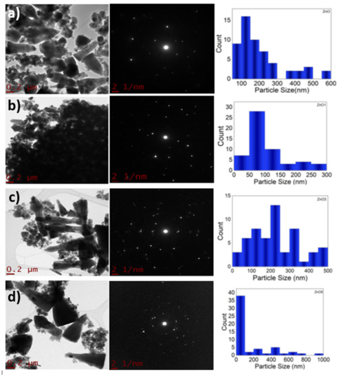 In Figure 2, TEM images of ZnO shows spindle shaped nanoparticles [35]; however, as the Ca content increases, the size of Zn particles increases and the appearance of small particles corresponding to Ca was observed. To determine the size distribution of the nanoparticles, software was used measuring nanoparticle size at 50 nm [34].