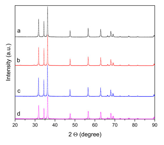 The X-ray powder diffraction patterns were acquired using an XRD Panalytical diffractometer (Empyrean, Almelo, Netherland) equipped with Cu Kα radiation (λ = 0.154 nm). Data were collected from 10° to 90° (2θ) with a scan rate of 0.02°/0.2 s. The average crystal size was determined using the Scherrer equation as follows: