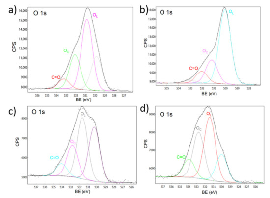 Figure 7 shows the XPS analysis corresponding to oxygen. The peak corresponding to O 1s can be broken down into various Gaussian components, where the band present at approximately 533 eV belonged to chemisorbed oxygen (OC), the band at 531 eV belonged to lattice oxygen (OL) species, whereas the signals present at approximately 534 eV can be assigned to the C = O bond in the nanocomposites, where increases in intensity were proportional to the percentage of the dopant [33,49].