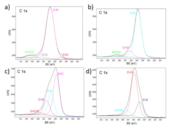 The spectra for carbon (C 1s) is shown in Figure 8, where the peak deconvolutions at 289, 287, 285, and 284 correspond to O-C = C, C = O, C-O and C = C, respectively [48]. The spectra indicates a shift towards higher binding energies when calcium ions are used as a dopant [33,49].