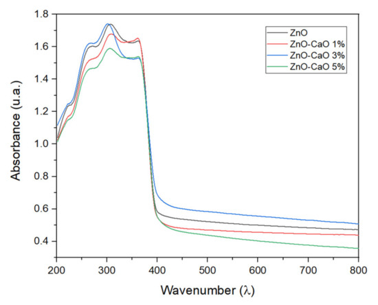 The optical absorbances obtained in the UV-vis analysis (Figure 9) can be attributed to the Zn-O electron transitions of ZnO. The results show a small shift in the red region (3.3 a 2.99 eV) [50]. Thus, the incorporation of CaO into ZnO produces only small variations in the band gap energy, Eg. Adding donor or acceptor impurities to a semiconductor creates energy levels near the conduction or valence band edges, as seen for the Zn-Ca 1 and Zn-Ca 5 nanocomposites. This behavior is in agreement with that reported by various authors [31,32,42], and indicates that the incorporation of calcium ions to the material presents small variations in the energy of the forbidden band without generating modifications in the stability of ZnO.