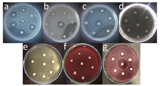 Antibiograms of the evaluated treatments, (a) E. coli, (b) E. faecalis, (c) S. Aureus, (d) S. mutans, (e) A. odontolyticus, (f) V. parvula, (g) F. nucleatum.