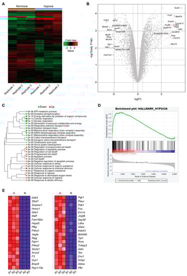 RNAseq of mCCDcl1 cells following 24 h of normoxia (21% O2) or 24 h of hypoxia (0.2% O2). (A) Heatmap of the 1000 most up- or down-regulated genes following normoxia or hypoxia (n = 3 per condition). Green indicates down-regulated genes, and red up-regulated genes. (B) Volcano plot of differentially expressed genes in mCCDcl1 cells following 24 h hypoxia: the x-axis represents the log2 fold change, and the y-axis represents log10 of the adjusted p-value. The top 15 up- and down-regulated genes are indicated in red and blue, respectively. (C) Gene ontology analysis of significantly up- (red) and down-regulated (green) pathways following 24 h hypoxia. Adjusted p-values are indicated, with a false discovery rate (FDR) of 0.1. (D) Enrichment plot of genes associated with the GO hallmark term “hypoxia” (normoxia “control”, and hypoxia “treatment”). (E) Top 40 genes (1–20 left column, 21–40 right column) within the GO hallmark term “hypoxia” in mCCDcl1 cells enriched following hypoxia (H) relative to normoxia (N). The three replicates are indicated (R1, R2, and R3).