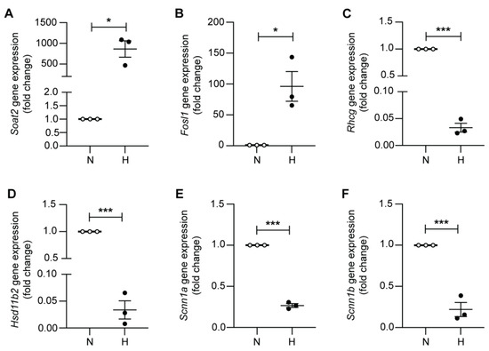 RNAseq validation of differentially-regulated genes. Relative mRNA expression levels of (A) Soat2, (B) Fosl1, (C) Rhcg, (D) HSD11b2, (E) Scnn1a (αENaC), and (F) Scnn1b (βENaC) in mCCDcl1 cells following 24 h of normoxia (N) or hypoxia (H) (n = 3 per condition). * p < 0.05, *** p < 0.001.
