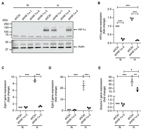 We next investigated the expression of genes directly regulated by Hif-1α. Following 24 h of hypoxia, mCCDcl1 cells displayed a strong and robust up-regulation of Egln1, Egln3, Vegfa, Slc2a1 (Glut1), Pag1, and Serpine1 (Figure 3A–F), whereby the protein expression of Hif-1α itself was consistently enhanced in all analyzed replicates under hypoxic conditions (Figure 3G). We next aimed to knock down Hif-1α in mCCDcl1 cells using lentiviral-based short hairpin RNA (shRNA) transduction. Three different shRNA sequences targeting Hif-1α were tested, from which one (shHif-1α-2) led to a reduction of 80–85% of Hif1a expression as compared to the control shRNA under both normoxic and hypoxic conditions (Figure 4A,B). Efficient knockdown of Hif-1α suppressed the hypoxia-dependent up-regulation of Egln1 and Egln3, and also induced a significant reduction in Serpine1 expression under hypoxic conditions (Figure 4C–E).