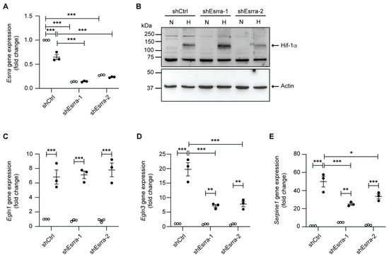 shRNA-mediated knockdown of ESRRA leads to reduced Egln3 and Serpine1 levels independently of Hif-1α. (A) Relative mRNA expression levels of Esrra in mCCDcl1 cells transduced with control shRNA (shCtrl) and two different shRNAs targeting Esrra (shEsrra-1 and shEsrra-2) in normoxia (N) or following 24 h of hypoxia (H) (n = 3 per condition). (B) Representative immunoblot of Hif-1α in mCCDcl1 cells transduced with control shRNA (shCtrl) and two different shRNAs targeting Esrra (shEsrra-1 and shEsrra-2) in normoxia (N) or following 24 h of hypoxia (H). β-actin was used as a loading control. Relative mRNA expression levels of (C) Egln1, (D) Egln3, and (E) Serpine1 in mCCDcl1 cells transduced with control shRNA (shCtrl) and two different shRNAs targeting Esrra (shEsrra-1 and shEsrra-2) in normoxia (N) or following 24 h of hypoxia (H) (n = 3 per condition). * p < 0.05, ** p < 0.01, *** p < 0.001.