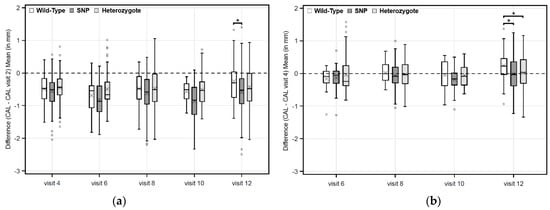 Boxplots of GATA-3: Mean CAL differences to visit 2 (a) and to visit 4 (b) in the total collective: * p-values are from Mann–Whitney U-tests for the pairwise comparison with the wild-type group. Negative values represent an improvement and positive values represent a deterioration. Abbreviations: CAL: mean clinical attachment level per patient, SNP: single nucleotide polymorphism, mm: millimeter, × marks the mean.