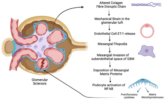In AS, changes in GBM composition are the starting point of the pathogenic pathway that involves all three cell types of the glomerulus. The thinner GBM has fewer interchain disulfide crosslinks, which diminishes the elasticity of glomerular tufts; this makes them susceptible to mechanical forces of normal glomerular capillary flow, which has the highest capillary pressure in the human body [8,9,10]. One of the earliest events in AS is the significantly elevated expression of endothelin-1 (ET-1) in the endothelial cells, which seems to be related to an elevated biomechanical strain on glomerular capillary tufts. ET-1 elevation causes the activation of endothelin A receptors (ETARs), which in turn leads to downstream activation of CDC42, which results in mesangial filopodia. The mesangial filopodia progressively invade the subendothelial space of GBM, with deposition of mesangial matrix proteins, including laminin 211 [10,11]. Laminin 211 activates focal adhesion kinase (FAK) on podocytes, which activates NF-ĸB (Nuclear factor kappa B), resulting in elevated expression of pro-inflammatory cytokines as well as matrix metalloproteinases. In addition, laminin 211 contributes to altering GBM permeability and appears to be important to the progressive increase in proteinuria [10]. The deposition of mesangial matrix proteins in the GBM induces podocyte injury [10]. Progressive loss of podocytes causes glomerulosclerosis, which is associated with reduced glomerular blood perfusion to post-glomerular peritubular capillaries and reduced or absent glomerular filtrate, which together induce ischemic and inflammatory tubular cell injury, death, and peritubular inflammation and scarring [12]. The pathogenic pathways of AS are described in Figure 1.