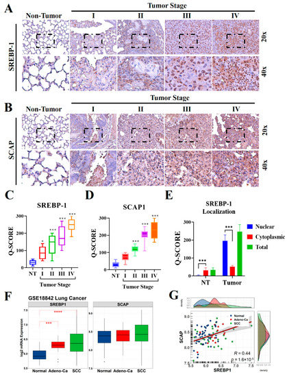 SCAP and SREBP-1 expression in NSCLC and normal lung tissues. Representative IHC images used to measure the differential expression of (A) SREBP-1and (B) SCAP in NSCLC tissues from patients with stage I, II, III, and IV disease and in non-tumor lung tissue samples. (C–E) Quantification of SREBP-1 and SCAP expression in non-tumor and tumor lung tissue of different stages, with in-depth analysis of SREBP-1 nuclear localization in lung tissue. (F,G) Expression and correlation of SREBP-1 and SCAP at the mRNA level in NSCLC samples from the GSE18842 lung cancer microarray dataset compared to the normal lung samples. * p < 0.05, *** p < 0.001, and **** p < 0.0001.
