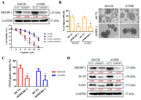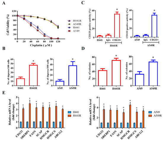 After demonstrating that SREBP-1 was overexpressed in NSCLC cells, we investigated the likelihood that SREBP-1 overexpression is implicated in the CSCs-like and chemoresistant phenotypes of NSCLC cells. Using the wild-type and cisplatin-resistant (R) human NSCLC cell lines H441 and A549, we demonstrated that although the H441 and A549 cells were sensitive to cisplatin treatment, with IC50 concentrations of 58 µM and 47 µM, respectively, H441R and A549R cells were less responsive to the anticancer cytotoxicity of cisplatin, with a concentration of 120 µM producing a cytotoxicity rate of approximately 50% in both cell lines (Figure 2A). Furthermore, we demonstrated that the levels of CD133 were significantly higher in H441R and A549R cells than in their wild-type counterparts (13.36-fold higher, p < 0.05 and 14.15-fold higher, p < 0.05, respectively; Figure 2B), with enhanced capacity for tumorsphere formation (H441R vs. H441: 2.84-fold higher, p < 0.05; A549R vs. A549: 4.25-fold higher, p < 0.05; Figure 2C). In addition, H441R and A549R cells formed more colonies than did their wild-type counterparts (1.65-fold more, p < 0.05 and 2.03-fold more, p < 0.05, respectively; Figure 2D). The CSCs-like phenotype was strongly associated with the significant upregulation of CD133, SREBP-1, FASN, SCAP, HMGCR, HMGCS, and ABCG2 mRNA expression levels (Figure 2E). These results are, at least in part, indicative of the crucial role of SCAP-dependent lipogenic signaling in the LCSCs and chemoresistant phenotypes of NSCLC cells.