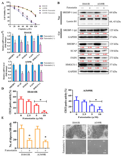 Fatostatin treatment decreased cisplatin resistance and cancer stemness in NSCLC cells. (A) Graphical representation of the effect of 20- to 120-μM cisplatin on A549R and H441R cells left untreated or pretreated with 5 µM fatostatin. (B) Representative Western blot images indicating protein expression of mature (m) SREBP-1 undergoing cleavage in nuclear (Nuc) compartment (top panel), precursor (p) SREBP-1 in cytoplasm (Cyt), and constitutive expression of SCAP, INSIG1, FASN, and HMGCS-1 in whole lysate of A549R and H441R cells either left untreated or treated with 5-µM fatostatin for 24 h. Lamin B1 and GAPDH were loading control of nuclear and whole lysate, respectively. (C) Bar chart showing the comparative expression of SREBP-1, SCAP, FASN and HMGCS-1 mRNA in H441R and A549R cells treatment with/without 5μM Fatostatin. (D) Effect of 2.5- to 10-μM fatostatin on the percentage of CD133+ A549R and H441R cells, as demonstrated by flow cytometry. (E) Images and graphical representations of the effect of 5-μM fatostatin on the number and size of spheres formed by A549R and H441R cells. Data are represented as means ± SDs from assays performed in triplicate at least 3 times. * p < 0.05.