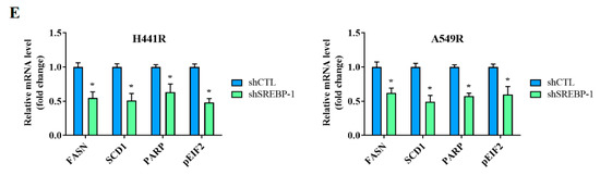 We examined the effects of shRNA-induced silencing of SREBP-1 in H441R and A549R cells (Figure 4A). Compared with their wild-type counterparts, shSREBP-1-transfected H441R and A549R cells exhibited significantly higher sensitivity to cisplatin in a dose-dependent manner (Figure 4A, lower panel). In addition, relative to the vector control (VC) cells, shSREBP-1-transfected H441R and A549R cells formed significantly smaller and fewer tumorspheres (2.8-fold, p < 0.05 and 3.0-fold, p < 0.05, respectively; Figure 4B). Consistent with earlier results, transfection with shSREBP-1 significantly reduced the percentage of CD133+ H441R and A549R cells (by 31%, p < 0.05 and 47%, p < 0.05, respectively; Figure 4C). Moreover, shSREBP-1 markedly suppressed the expression of SREBP-1, SCAP, FASN, and SREBP2 in H441R and A549R cells (Figure 4D). To confirm the finding, we also compared the perturbation following shRNA-mediated knockdown of SREBP-1 between unsorted parental cell lines and resistant clone that also resulted in an attenuated CD133 activity, reduced generation of tumor sphere, and suppression of colony formation in A549 NSCLC cell line (Supplementary Figure S2A–C). Therefore, these results might indicate to some extent that SREBP-1 determined metabolic axis to provoke stemness phenotype of NSCLC. In addition, relative to their VC counterparts, shSREBP-1-transfected H441R and A549R cells exhibited profound inhibition of stearoyl-CoA desaturase 1 (SCD1) expression with the concomitant upregulation of FASN, poly(ADP-ribose) polymerase (PARP), and phosphorylated eukaryotic initiation factor 2 (peIF2) mRNA expression (Figure 4E), suggesting enhanced lipotoxicity, accumulation of reactive oxygen species (ROS), and ER stress.