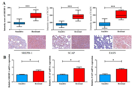 Finally, we validated our in vitro findings by using our own NSCLC cohort, which consisted of 20 pairs of cisplatin-sensitive and cisplatin-resistant clinical samples. Consistent with our aforementioned findings, according to the results of IHC staining, the cisplatin-resistant samples exhibited significantly higher levels of SREBP-1 (1.5-fold, p < 0.001), SCAP (1.86-fold higher, p < 0.001), and FASN (1.76-fold, p < 0.001) expression than did the cisplatin-sensitive samples (Figure 5A). The qRT-PCR analysis supported the IHC staining results at the mRNA level (Figure 5B).