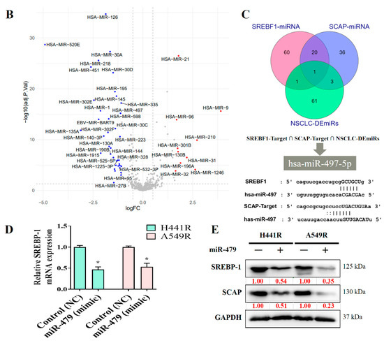 miRNA expression profiles of NSCLC cells. (A) Heat map and (B) volcano plot of miRNA expression profiles of NSCLC cells. Differentially expressed (DE) miRNAs were identified from the GEO (GSE102286) database containing 179 total lung patient samples using the criteria of |logFC| > 1 and p < 0.05. (C) Intersection analysis of predicted miRNAs targeting SREBP-1 and SCAP. Predictions were based on the ENCORE database. (D) qRT-PCR and (E) Western blot images indicating the effect of the introduction of hsa-miR-497-5p (mimic) and its efficacy of hsa-miR-497-5p in targeting SREBP-1 in H441R and A549R cells. * p < 0.05.