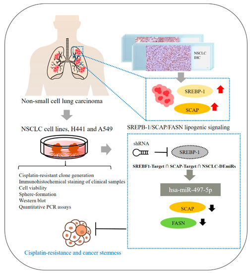 SREBP-1 plays a key role in NSCLC metabolism and is involved in the maintenance of the stemness and chemoresistance of NSCLC cells. Using the clinical samples from our NSCLC cohort and GSE18842 dataset, we demonstrated that aberrant expression of SREBP-1 and SCAP was associated with disease progression and a poor prognosis in lung cancer, thus indicating their potential clinical utility as reliable diagnostic or prognostic biomarkers and as potential molecular targets for the treatment of lung adenocarcinoma. We demonstrated that prolonged exposure to cisplatin desensitized NSCLC cells to cisplatin, leading to the development of cisplatin-resistant NSCLC cells with CSC-like phenotypes that are characterized by enhanced SREBP-1-mediated lipogenesis. Furthermore, we demonstrated that the inhibition of SREBP-1 by fatostatin or through shRNA- or miRNA (hsa-miR-497-5p)-mediated regulation increased the sensitivity of cisplatin-resistant cells to cisplatin and suppressed the cancer stemness of lung cancer cells. Our results may serve as a reference for the design of future clinical trials of therapeutic modalities that target the SREBP-1/hsa-miR-497-5p/SCAP/FASN oncometabolic signaling axis to overcome chemoresistance in patients with lung cancer.