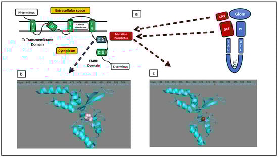 (a) Normal localization of CNNM2 (red color) within nephron segments (Glom: Glomerulus, PT: Proximal Tubule, DTL: Descending Thin Limb of Loop of Henle, TAL: Thick Ascending Limb of Loop of Henle, DCT: Distal Convoluted Tubule, CNT: Connecting Tubule). CNNM2 protein consists of four transmembrane domains (T1, T2, T3, T4), two cystathionin beta synthase domains (CBS1, CBS2), and a C-terminal cyclic nucleotide-binding homology (CNBH) domain. The Pro482Ala mutation is localized within the CBS1 domain. (b) Representation of Proline (normal variant—pink color) and it’s valency in the CBS1 domain. (c) Representation of Alanine (mutant—red color) and its valency in the CBS1 domain.