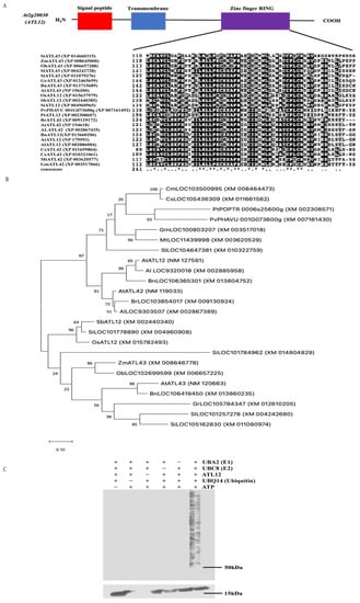 - Serrano, M.; Parra, S.; Alcaraz, L.D.; Guzmán, P. The ATL gene family from Arabidopsis thaliana and Oryza sativa comprises a large number of putative ubiquitin ligases of the RING-H2 type. J. Mol. Evol. 2006, 62, 434–445. [Google Scholar] [CrossRef]