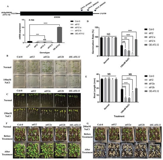 Phenotypic analysis of ATL12 in response to salt stress. (A) Analyses of T-DNA mutants in the AT2G20030 gene. The locations of the T-DNA insertions in the AT2G20030 gene, SALK_066923C, SALK_095030C, and SALK_201056C, are shown by arrowheads. qRT-PCR analysis of ATL12 transcript expression in the atl12 mutant, Col-0 wild type, and ATL12 over-expression line. Error bars indicate mean ± SD of three independent experiments; (B) Images of Col-0 wild type, atl12 mutants, and overexpression line germinated in normal and 150 mM NaCl contained MS agar plates. (C) Images of Col-0 wild type, atl12 mutants, and overexpression line root length growth. (D) Germination rate analysis of Col-0 wild type, T-DNA insertional mutants of atl12, atl12a, and atl12b, and the overexpression (OE) line of ATL12 in response to salt stress. Error bars indicate mean ± SD of five independent experiments. (E) Primary root length growth analysis of Col-0 wild type, T-DNA insertional mutants of atl12, atl12a, and atl12b, and the overexpression (OE) line of ATL12 in response to salt stress. (F,G) Salt tolerance of Col-0 wild type, atl12 mutants, and overexpression line under normal condition and salt condition. NS: no significance; *** indicated p < 0.001, **** indicated p < 0.0001.