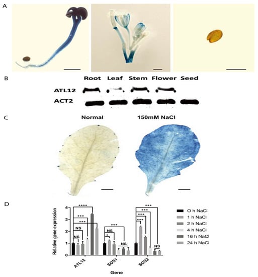 To determine if the expression of ATL12 is induced by salt treatment, we used histochemical staining of ATL12 promoter GUS fusion transgenic plants treated with 150 mM NaCl. The results showed that ATL12 is rarely expressed under normal conditions, while pATL12:GUS expression was strongly induced after being treated with 150 mM NaCl for 16 h, as shown in Figure 3C. Additionally, we performed qRT-PCR to examine the expression of ATL12 in Arabidopsis treated with 150 mM NaCl at early (1 h, 2 h, and 4 h) and late stages (16 h and 24 h) post-salt treatment. The salt stress-responsive genes salt-overly sensitively 1 and 2 (SOS1 and SOS2) and the reference gene beta-actin were also determined using qRT-PCR. As shown in Figure 3D, the expression of ATL12 is increased after 4 h and is significantly increased at 16 h. Compared to ATL12, SOS1 and SOS2 are significantly increased during the early stages of salt stress, as shown in Figure 3D. Our results show that ATL12 expression is salt-inducible and its expression is upregulated at later stages in response to NaCl.