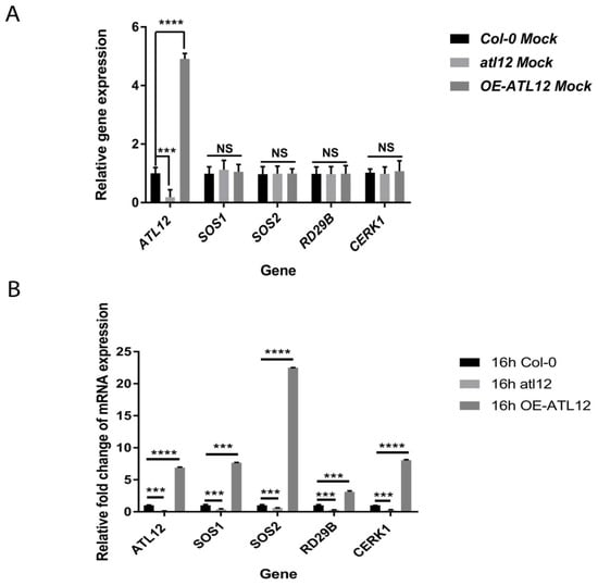 qRT-PCR analysis of ATL12, SOS1, SOS2, RD29B, and CERK1 expression in Col-0, atl12, and OE-ATL12 under normal conditions and salt stress. (A) qRT-PCR analysis of salt responsive genes under normal conditions; (B) qRT-PCR analysis of salt responsive genes in response to salt. Asterisks indicate statistically significant differences between the samples, according to the One-way ANOVA analysis and multiple comparison post Tukey’s test. **** indicates p < 0.0001, *** indicates p < 0.001, and NS indicates not significant. The black line indicates that significant differences are present between datasets. The error bar indicates means ± the SD of three independent biological replicates.