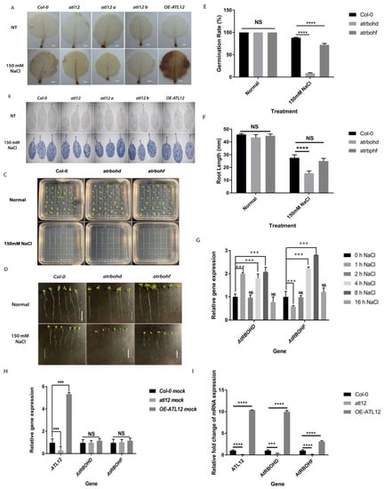 Detection of reactive oxygen species production in over-expression of ATL12 in response to NaCl stress. (A) DAB staining of wild-type, atl12 mutants and over-expression seedlings in response to salt treatment. DAB staining was performed to indicate areas of hydrogen peroxide production (brown stain indicated the location of hydrogen peroxide activity). The white scale bar indicates 1 mm. (B) Trypan blue staining of wild-type, atl12 mutants, and over-expression seedlings in response to salt treatment. (C) Germination rate assay in Col-0, atrbohd, and atrbohf in response to 150 mM NaCl. (D) Root length growth assay in Col-0, atrbohd, and atrbohf in response to 150 mM NaCl. (E) Germination rate analysis of Col-0 wild type, atrbohd, and atrbohf mutant in response to salt stress. (F) Root length growth of Col-0 wild-type, atrbohd, and atrbohf mutant in response to salt stress. Error bars indicate mean ± SD of five independent experiments; NS: no significance; ***: p < 0.001, ****: p < 0.0001. White scale bar indicates 1.3 cm. (G) qRT-PCR analysis of ATL12, AtRBOHD, and AtRBOHF expression in response to salt stress. (H) qRT-PCR analysis of AtRBOHD, AtRBOHF, and ATL12 expression in mutant of atl12, Col-0 WT, and ATL12 over-expression line under normal conditions. (I) qRT-PCR analysis of AtRBOHD, AtRBOHF, and ATL12 expression in mutant of atl12, Col-0 WT, and ATL12 over-expression line under salt conditions.