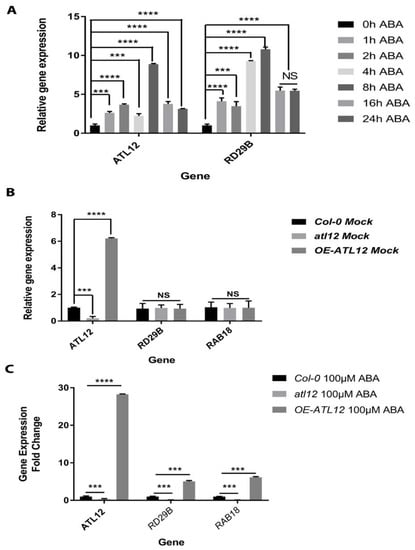 Abscisic acid signaling is known for regulating multiple physiological processes and is involved in abiotic stress tolerance [39]. Our results show that the ABA-responsive RD29B gene’s expression is induced in the OE-ATL12 line in response to salt stress (Figure 4B), which suggests that ATL12 might be involved in salt stress responses via ABA signaling. To investigate whether ATL12 expression is induced by ABA, ATL12’s expression pattern in response to ABA treatment was examined via qRT-PCR. Two-week-old Col-0 wild-type plants were treated with 0.75 μM ABA and tissues were harvested at different time points (Early-stage: 0 h, 1 h, 2 h, 4 h, and 8 h; Late-stage: 16 h and 24 h). Expression of the ABA-responsive gene RD29B was also examined as a marker gene and the ACT2 gene was used as an internal control. As shown in Figure 6A, ATL12 expression is continuously induced at all the time points and the expression of RD29B is highly induced at all time points. To further dissect the potential interaction between ATL12 and ABA, Col-0 wild-type, atl12 mutants, and OE ATL12 plants were treated with 100 mM ABA for 2 h, and then gene expression of ATL12, ABA-inducible genes RD29B and RAB18, and ACT2 was evaluated by qRT-PCR. There were no significant changes in RD29B and RAB18 expression under normal conditions (water treatment) as shown in Figure 6B. It was noted that RD29B and RAB18 expression were upregulated in OE-ATL12 plants, while their expression was downregulated in the atl12 mutant, as shown in Figure 6C. These data suggest that ATL12 gene expression is highly induced by ABA and that ATL12 is involved in some way with the ABA signaling pathway.