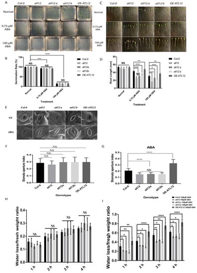 ATL12 modulates ABA response. (A) Images of Col-0 wild-type, atl12 mutants, and the overexpression line under normal, 0.75 μM, and 100 μM ABA contained MS agar plates. (B) Germination rate analysis. Error bars indicate mean ± SD of five independent experiments; (C) Images of Col-0 wild-type, atl12 mutants, and overexpression line root length growth under normal, 0.75 μM, and 100 μM ABA contained MS agar plates. (D) Primary root length analysis. Error bars indicate mean ± SD of five independent experiments; NS: no significance; *: p < 0.05, **: p < 0.01, ***: p < 0.001, ****: p < 0.0001. (E) SEM image of stomata aperture in Col-0 wild-type, atl12 mutants, and overexpression line under normal conditions and ABA treatment. (F,G) Stomatal aperture assay of Col-0, mutants atl12, and overexpression line ATL12 under control and ABA conditions. (H) Water loss assay of Col-0, mutants atl12, and overexpression line ATL12 under normal conditions. (I) Water loss assay of Col-0, mutants atl12, and overexpression line ATL12 under ABA treatment.