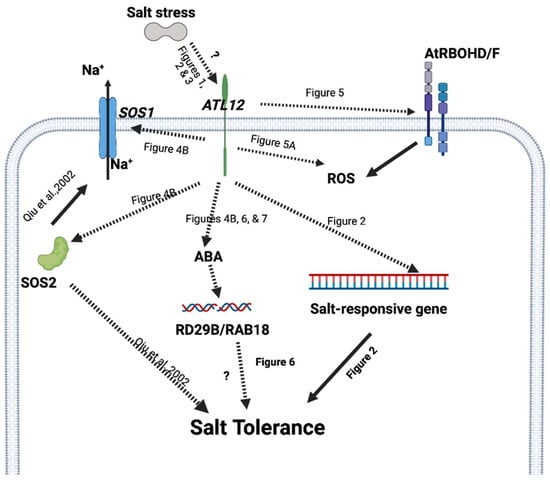 Proposed model for ATL12’s function in salt stress response. ATL12 is induced by salt stress and positively regulates salt tolerance in Arabidopsis seedlings (Figure 1, Figure 2 and Figure 3). Then ATL12 modulates salt stress responses via AtRBOHD/F-mediated ROS signaling (Figure 5), SOS1/2 signaling (Figure 4), and ABA-dependent signaling (Figure 6 and Figure 7) in Arabidopsis thaliana. A solid arrow indicates confirmed regulation or interaction. Dashed lines indicate our putative interactions with pathways or molecules that are confirmed by results. The question mark indicates further study is required.