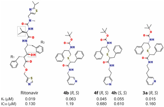Chemical structures of ritonavir and previously reported analogues from series III (4b, 4f, and 4h) [16] and V (3a) [17] that were used for structural and functional comparison in this study. The R1- and R2-phenyl side-groups are indicated. If the central hydroxyl group of ritonavir is removed, the phenyl side-groups would be in the R/R configuration. The listed IC50 values were measured for the BFC debenzylation activity of CYP3A4 using the same method as in this study. In cobicistat, a close derivative of ritonavir, there are only two modifications (boxed): the backbone hydroxyl group is removed, and the valine chain in the end-moiety is replaced with the bulkier morpholine ring.