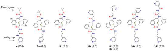 Our previous study showed that one-atom extension of the pyridyl–ethyl spacer markedly improved the binding affinity and inhibitory potency of ritonavir-like compounds [17]. The head-group linker elongation allowed inhibitors to adopt a more relaxed conformation and led to stronger heme ligation, which was evident from the shorter and near-perpendicular Fe–N bond. To gain further insight into how the pyridine–R1 spacer affects the inhibitory potency and ligand-binding mode, we synthesized 4 as a counterpart of 3a, the most potent inhibitor from the previous series (Figure 1) [17], by replacing the flexible aliphatic spacer with a rigid peptide bond (Figure 2). Compounds 5a and 5b, in turn, were designed with a traditional pyridyl–ethyl or pyridyl–propyl spacer, respectively, but the heme-ligating N-heteroatom was moved from the meta- to para-position. It was anticipated that comparison of 5a–b with the meta-N-containing 4f and 3a (Figure 1) would clarify if/how positional changes in the electron-donating nitrogen atom affect the inhibitory potency and binding mode. Finally, as a first step toward optimization of the terminal group, we synthesized five compounds where the protective tert-butyloxycarbonyl (Boc) group, which served as the R3 end moiety, was substituted with a meta-N-pyridine linked through various spacers. The first three bi-pyridine compounds were near-symmetrical and contained either a pyridyl–methyl (8a) or pyridyl–ethyl linker (8b and 8c). Although the R/S side-group configuration was found to be the most favorable in binding CYP3A4, a few S/S stereoisomers were among the most potent inhibitors as well [17,30]. Therefore, we included 8c (S, S) along with 8b (R, S) to assess the impact of stereochemistry. The last two compounds, 10a and 10b, had the most optimal pyridyl–propyl head-group spacer, while the end-pyridine was linked via a single or double amide bond, respectively (Figure 2). This allowed us to test the impact of the length of the R2–R3 spacer.