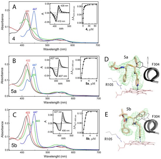 Spectral properties of 4 and 5a,b and the binding modes of the latter two compounds. (A–C) Ligand-induced spectral changes in CYP3A4. Absorbance spectra of ferric ligand-free and inhibitor-bound CYP3A4 are in black and red, respectively. Spectra of ferrous ligand-bound CYP3A4 and its CO adducts are in green and blue, respectively. Left insets are the difference spectra recorded during equilibrium titrations; right insets are the titration plots with quadratic fittings. The derived spectral dissociation constants (Ks) are given in Table 1. (D,E) Crystallographic binding modes of 5a and 5b, respectively. Part of the adjacent I-helix and Phe304 in the inhibitory complexes and water-bound CYP3A4 (5VCC structure) are depicted in gray and black, respectively. Polder omit electron density maps contoured at 3σ level are shown as green mesh. The 5a- and 5b-bound structures of CYP3A4 have the PDB ID codes 7UF9 and 7UFA, respectively.