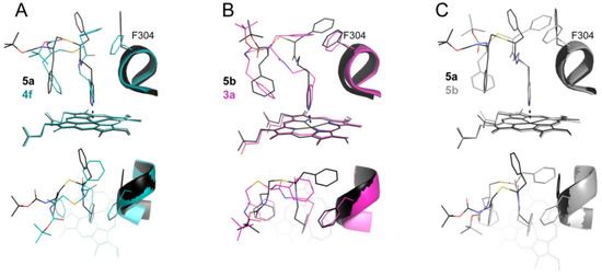 Structural comparison of 5a–4f (A), 5b–3a (B), and 5a–5b pairs (C). The side and top views (upper and lower panels, respectively) illustrate differences in the backbone and side-group positioning. The central part of the I-helix is displayed to show the adaptive rotameric changes in Phe304. The 3a- and 4f-bound structures of CYP3A4 used for comparison have PDB ID codes of 7KVH and 6DAC, respectively.
