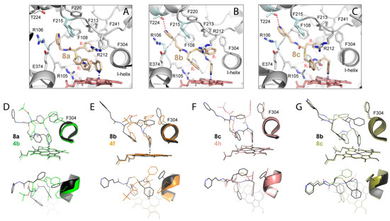 Interactions mediated by 8a–c in the active site of CYP3A4 (A–C) and structural comparison of the 8a–4b (D), 8b–4f (E), 8c–4h (F), and 8b–8c pairs (G). (A–C) 8a and 8c bind in the reverse orientation, where the end-pyridine ligates to the heme and the head-group stacks in the substrate access channel, while the R1 and R2 side-groups (indicated) are still placed at the P1 and P2 sites, respectively. In all three inhibitors, the pyridine group bound in the substrate channel forms π–π and cation–π interactions with Phe215 and the guanidine group of Arg106, respectively. The H-bonds to Thr224 are established only by 8b and 8c (shown as red dotted lines). (D–G) The side and top views of structural overlays (upper and lower panels, respectively) highlight positional differences in the backbone and functional groups. The central part of the I-helix is depicted to demonstrate the adaptive rotameric changes in Phe304. The 4b-, 4f-, and 4h-bound CYP3A4 structures used for comparison have the PDB ID codes 6DA3, 6DAC, and 6DAG, respectively.