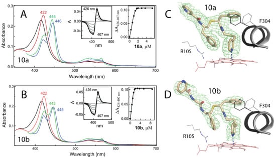 Spectral properties (A,B) and the binding modes of 10a,b (C,D). (A,B) Ligand-induced spectral changes in CYP3A4. Absorbance spectra of ferric ligand-free and inhibitor-bound CYP3A4 are in black and red, respectively. Spectra of ferrous ligand-bound CYP3A4 and its CO-adduct are in green and blue, respectively. Left insets are the difference spectra recorded during equilibrium titrations; the right insets are titration plots with quadratic fittings. The derived Ks values are listed in Table 1. (C,D) Binding modes of 10a–b observed in the crystal structures. The central part of the I-helix and Phe304 in the inhibitory complexes and water-bound CYP3A4 (5VCC structure) are depicted in gray and black, respectively. Polder omit electron density maps contoured at 3σ level are shown as green mesh. The 10a- and 10b-bound structures of CYP3A4 have the PDB ID codes 7UFE and 7UFF, respectively.