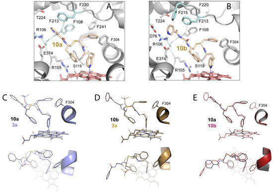 10a and 10b co-crystallized with the wild-type CYP3A4 in the I222 space group, with one loosely packed molecule per asymmetric unit. Similar to other pyridyl–propyl containing analogues [17], the binding modes of 10a,b could not be accurately defined in this crystal form due to high thermal motion and discontinuous electron density maps. To overcome this problem, we used the same strategy and co-crystallized 10a,b with the CYP3A4 variant containing two surface mutations, K421A and K424A. This variant preferably crystallized in the C2 space group, where one of the two molecules present in the asymmetric unit was well defined. As seen in Figure S2, there were only minor differences in the ligand-binding mode imposed by distinct crystal packing. The structures of 10a- and 10b-bound CYP3A4 were determined to 2.4 and 2.7 Å resolution, respectively (Table S2). The best-defined molecules from each structure (molecules A) were used for structural and comparative analysis.