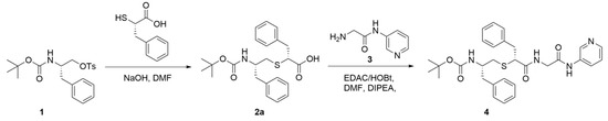 Compound 1 was prepared as described previously [39,40,41], with Boc-protection and tosylation of commercially available L-phenylalaniol. Compounds 2a and 2b were also prepared as described previously [39,40,41], with either D- or L-α-thio-phenylalanine, respectively [42].