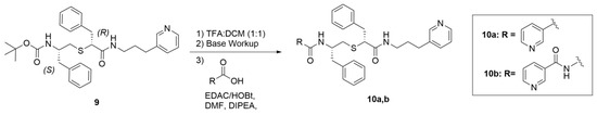 Synthesis of 10a,b is outlined in Scheme 4. Compound 9 (0.1 g, 0.19 mmol), which was prepared as described previously for the series-V compound 3a [17], was dissolved in 2 mL DCM and placed in an ice bath. An amount of 2 mL of TFA was added dropwise and the solution was stirred at room temperature for 2 h. Upon completion, the volatiles were evaporated. The residue was neutralized with saturated NaHCO3 and extracted with DCM (3x excess). The combined DCM was washed with brine, dried over MgSO4, and concentrated in vacuo to produce the crude Boc-deprotected propyl-pyridyl thioether as a yellow oil, which was used in the next step without further purification. LRMS m/z calculated for C26H32N3OS [M + H]+: 434.2. Found: 434.2.