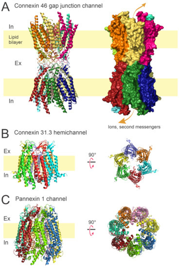 Overall architecture of gap junction channels, connexin hemichannels, and Panx-1 channels. (A) Ribbon and surface representations of the Cx46 GJ channel viewed from the lateral side. The dodecameric assembly allows the permeation of ions and small metabolites between adjacent cells. (B) Ribbon model for the Cx31.3 hemichannel viewed from lateral side (left) and from the extracellular side (right). Hemichannels assemble in hexamers and provide a conduction pathway for ions and small molecules between extracellular and intracellular compartments. (C) Ribbon representations of the Panx-1 channel. Panx-1 channels assemble as heptamers and provide a pathway for paracrine/autocrine signaling. Protein data bank (PDB) codes: 7JKC (Cx46) [36], 6L3U (Cx31.3) [37], and 6WBF (Panx-1) [38].