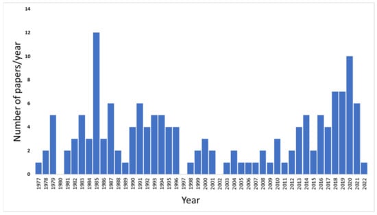 Number of publications per year (from 1977 to 2022) on Gal-3BP and viral infections. The search was performed using PubMed, Scopus, and Google Scholar databases, using the following key words: “(90K OR LGALS3BP) AND virus”.