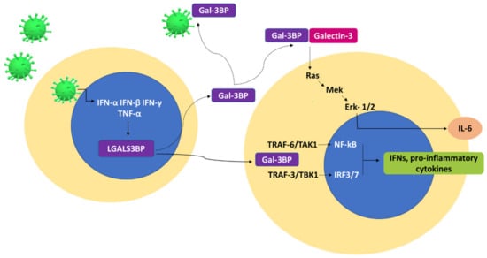 The protein was originally found to be elevated in patients infected with HIV-1 [,]. Subsequent studies reported elevated levels of Gal-3BP in various viral infections, including HBV, HCV [], hantavirus [], and dengue virus []. These studies showed that Gal-3BP displayed an antiviral activity [,,], which was related to the induction of IFN and proinflammatory cytokines, thus limiting virus expression and replication. Other studies showed that infection by influenza A virus (IAV), vesicular stomatitis virus (VSV), and herpes simplex virus (HSV) was associated with upregulated expression of Gal-3BP mRNA in mouse embryonic fibroblasts (MEFs) and in IAV-infected murine lungs []. Recently, increased levels of Gal-3BP have been found during SARS-CoV-2 infection and a correlation between Gal-3BP levels and COVID-19 disease severity has been observed [,].