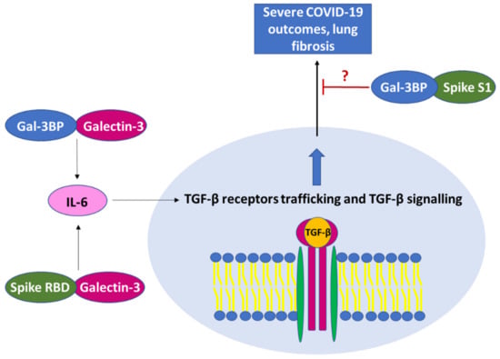 A multitude of epidemiological and clinical studies have documented that patients affected by pathological conditions such as cancer, viral infections, and autoimmune disorders frequently display supranormal levels of Gal-3BP [,,,,,], which are associated with unfavorable clinical outcomes [,,,,,,,]. On the contrary, low levels of Gal-3BP have been found to be associated with an augmented response to antiviral therapies []. Increased levels of Gal-3BP have been detected in diverse virus infections, including human immunodeficiency virus 1 (HIV-1), hepatitis B virus (HBV), hepatitis C virus (HCV), hantavirus, and dengue virus, and have been associated with an important antiviral significance [,,]. Data have been presented to show that the activities of Gal-3BP in viral infections are mediated by the interaction of the protein with diverse intracellular and extracellular partners, which results in the induction of IFN and proinflammatory cytokines. In particular, interaction with galectin-3 [], a multifunctional β-galactoside-binding animal lectin that is a modulator of both acute and chronic inflammation, is known to promote cell-to-cell adhesion and induce IL-6 and proinflammatory-signaling cascades []. Recently, increased plasma levels of Gal-3BP have been found in SARS-CoV-2-infected patients (COVID-19 patients) and, like in other viral infections, a correlation has been observed between increased levels of Gal-3BP, disease severity, and poor clinical outcome [,]. Furthermore, Kuśnierz-Cabala et al. have presented preliminary data suggesting that Gal-3BP could be involved in mediating outcomes of COVID-19 patients, such as lung fibrosis []. Some of the detrimental effects of increasing levels of Gal-3BP in COVID-19 patients could be due to its interaction with galectin-3 []. Indeed, the Gal-3BP/galectin-3 axis has been demonstrated to activate the antiviral innate immune responses by targeting TNF receptor-associated factors (TRAF6 and TRAF3) complexes, thus inducing expression of IFN and proinflammatory cytokines, including interleukin-6 [], a known inducer of TGF-β signaling [,].