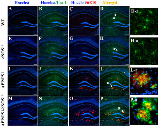 Representative immunofluorescent staining of Hoechst (blue; (A,E,I,M)), Hoechst/Iba-1 (green; (B,F,J,N)), Hoechst/6E10 (red; (C,G,K,O)) and merged Hoechst/Iba-1/6E10 (D,H,L,P) in the hippocampus of 8-months old male WT, eNOS+/−, APP/PS1 and APP/PS1/eNOS+/− mice at 10× magnification (scale bar 200 μm). High magnification (40×) images of merged Hoechst/Iba-1/6E10 staining in the area labeled a in WT (D-a), eNOS+/− (H-a), APP/PS1 (L-a) and APP/PS1/eNOS+/− mice (P-a) (scale bar 30 μm).