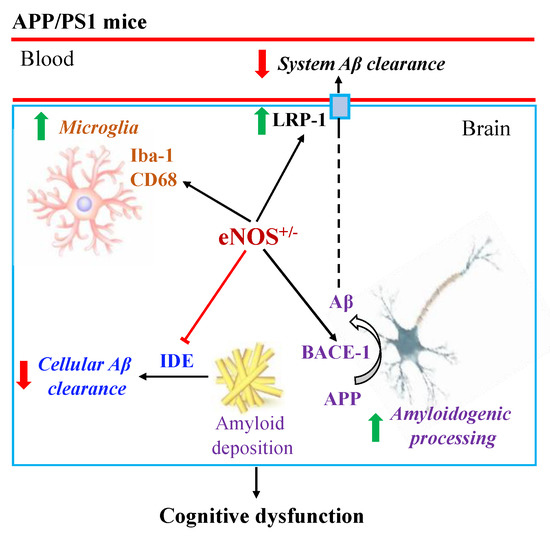 In summary, the present study, for the first time, demonstrated that APP/PS1/eNOS+/− mice (the APP/PS1 mice with partial eNOS deficiency) at 8 months of age display impaired spatial learning and increased Aβ plaque load and Iba-1 expression in the brain relative to APP/PS1 mice. As illustrated in Figure 8, partial eNOS deficiency augmented the amyloidogenic processing of APP (upregulated BACE-1), reduced cellular Aβ clearance (downregulated IDE) and system Aβ clearance (upregulated LRP-1, speculatively a compensatory response [14]), and exacerbated microglial pathology (likely increased inflammation) in APP/PS1 mice. These changes, along with other mechanisms, ultimately augmented cognitive dysfunction in APP/PS1 mice. Given the marked phenotype differences in APP/PS1 mice with and without partial eNOS deficiency at 8 months of age, future research is required to determine whether partial eNOS deficiency alters the onset of cognitive deficits or Aβ deposition in the brain in APP/PS1 mice. Since female APP/PS1 mice display more severe AD pathology relative to males [78], it is essential to characterize the sex differences in APP/PS1/eNOS+/− mice in the future. In conclusion, our findings further support the role of endothelial dysfunction in the pathogenesis of AD. APP/PS1/eNOS+/− mice offer a more clinically relevant model for early-stage AD with an element of endothelial dysfunction to better understand the disease pathogenesis and to develop preventive and/or therapeutic strategies.