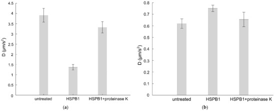 The lateral diffusion of STAR488-PEG-cholesterol in the supported bilayer of DOPC was measured by image-based total internal reflection–fluorescence correlation spectroscopy (ITIR-FCS). The diffusion coefficient (D) reflects the lateral diffusion of the probe and can be calculated from the diffusion law graph [27]. The D value of the fluorescent probe in DOPC was 4 µm/s2, which is similar to values found in other fluid phase studies [28]. HSPB1 administration resulted in a 75% drop in D, suggesting drastic structural alterations in the DOPC bilayer induced by the HSPB1 interaction (Figure 3a). The reduced lateral mobility was almost completely restored by subsequent proteinase K treatment. Interestingly, the same HSPB1 treatment affected the mobility of the fluorescent cholesterol probe only slightly and in the opposite direction if the model membrane was made of DOPC/SM/DChol (1:1:1), modeling a liquid-ordered, membrane raft composition (Figure 3b). This is in line with our observation that heat shock-induced HSPB1 is partially present in the membranes of B16-F10 cells, and within the total membrane fraction, it predominantly accumulates in the non-raft membrane regions (Figures S1 and S2). Proteinase K treatment reduced the effect of HSPB1 on the D value in both supported bilayers.