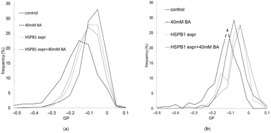 Effect of HSPB1 on membrane order impaired by benzyl alcohol (BA). Membrane order was monitored by calculating the general polarization (GP) of the di-4-ANEPPDHQ environment-sensitive probe. Control and HSPB1-overexpressing (a) B16-F10 cells and (b) E. coli cells were pretreated with 40 mM BA for 15 min after HSPB1 expression. GP values were read out from processed and segmented fluorescence images and the distribution was plotted as a histogram. The Kolmogorov–Smirnov test was performed to analyze the equality of GP distributions in sample pairs. Control and BA-treated samples differed from each other significantly (p < 0.05), but GP distribution was equal in cells overexpressing HSPB1 with and without BA administration.